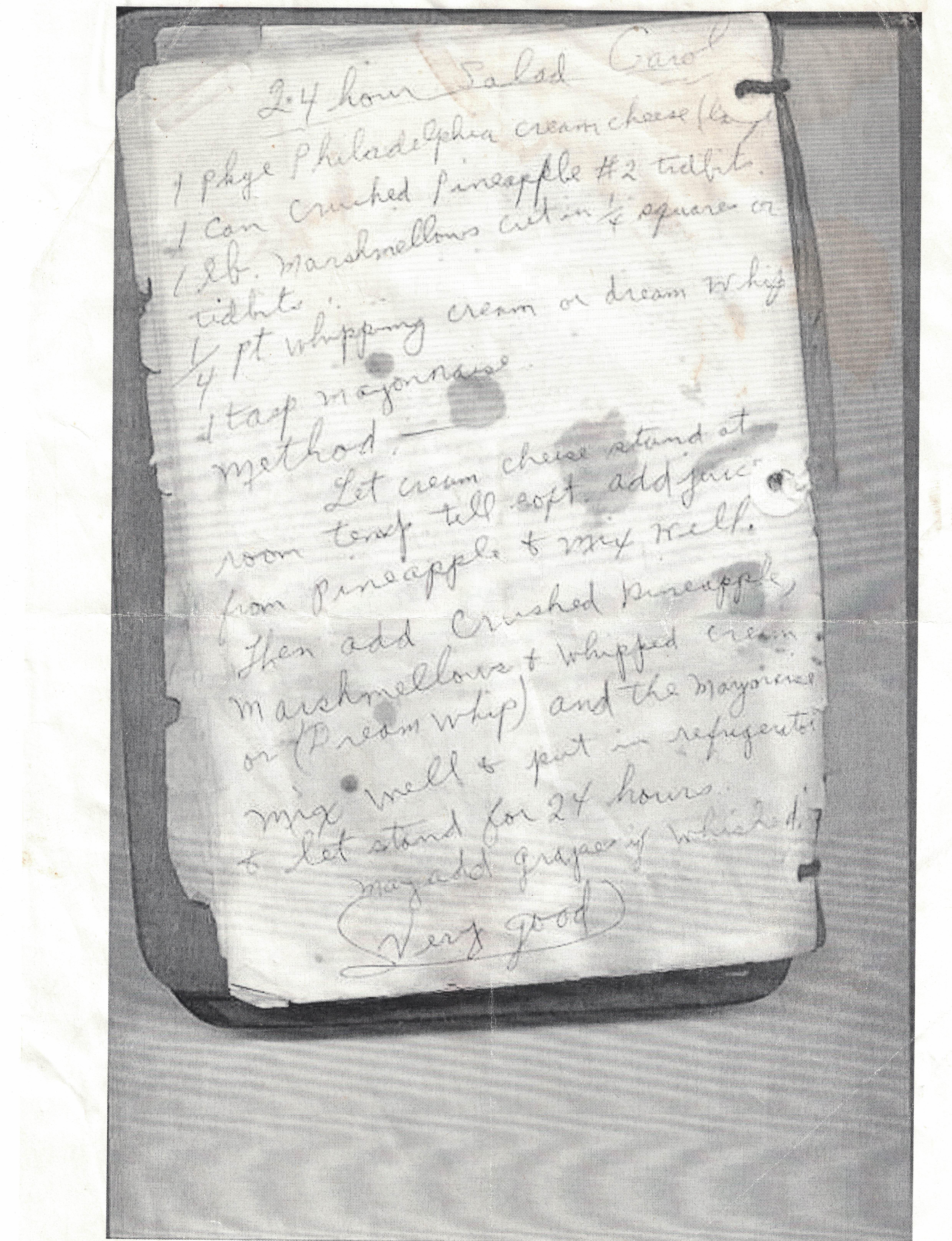 Ingredients - 1 package philidelphia cream cheese - 1 can crushed pineapple - 1 pound marshmallow tidbits - quarter pint whipping cream - 1 tablespoon mayonnase (optional)